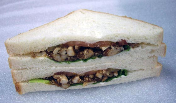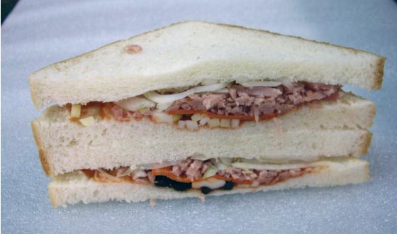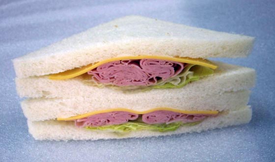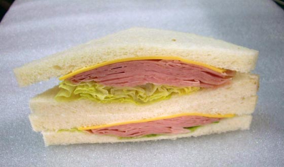 Установка для разрезки сендвичей, которые движутся по транспортерной ленте.