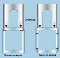 - Ближняя сварка (непосредственная): поверхность инструмента-волновода (сонотрода) удалена от свариваемых поверхностей не больше 6,3 мм. Важно, чтобы контактная поверхность сонотрода точно повторяла необходимый контур сварки.